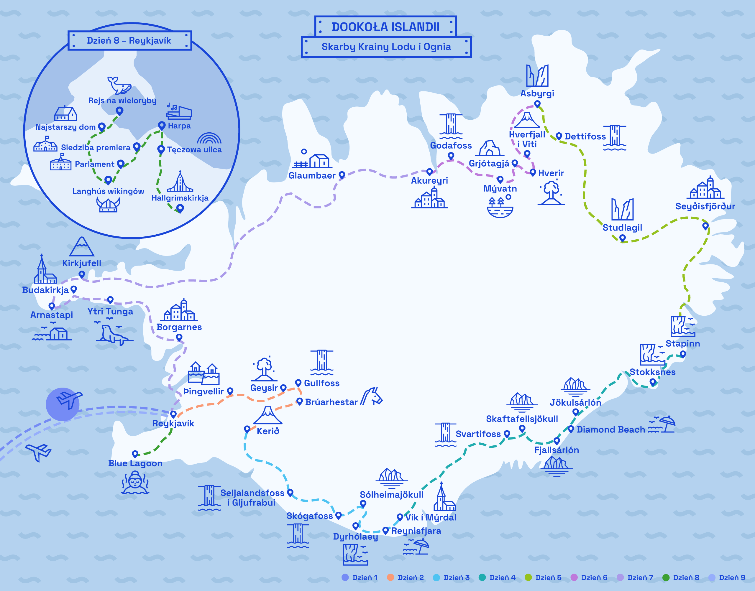 Odprężająca wizyta w Błękitnej Lagunie (Blue Lagoon - dodatkowo płatna)*, czyli najsłynniejszym spa na świecie. Relaks po intensywnym czasie w pięknej, błękitnej wodzie, która swój kolor zawdzięcza krzemionce. W cenie ręcznik, drink alkoholowy lub bezalkoholowy oraz maseczka na twarz. Jest to zdecydowanie zaraz po Złotym Kręgu najbardziej popularna atrakcja na Islandii. Transfer na lotnisko.